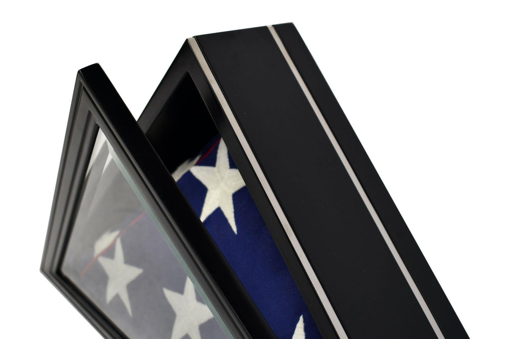 This flag display case features a triangular shape and two decorative metallic-colored inlay stripes. Good for showcasing a folded military, service, burial, or heirloom flag up to 5x9.5 feet. It has a glass front opening. Case comes fully assembled. Ideal for displaying on a shelf or table. Not intended for hanging on a wall.