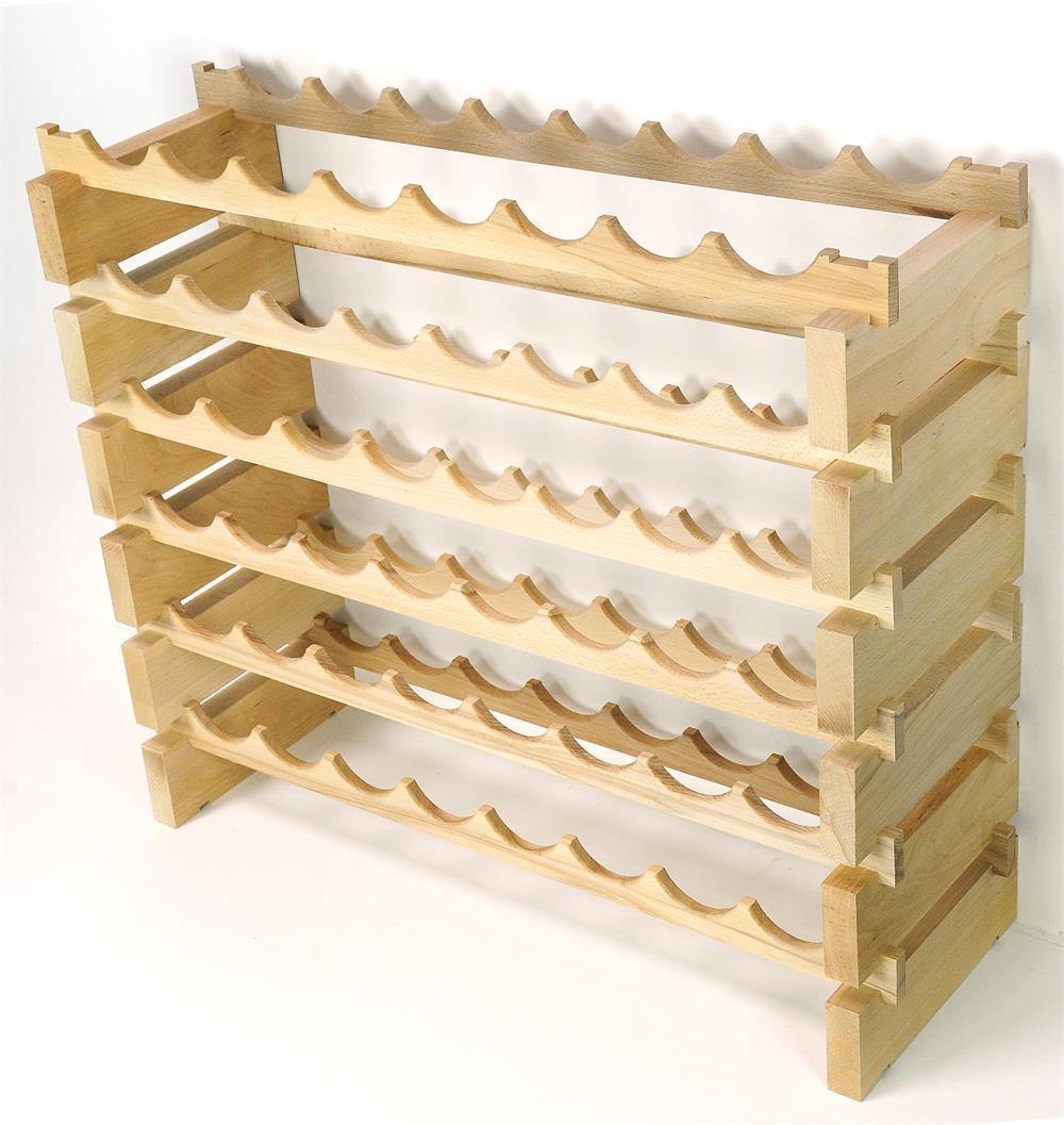 This modular hardwood wine rack is handcrafted from the same furniture-grade beech hardwood used in our display cases. Featuring rows with beveled edges, each rack can hold up to 8 standard-sized wine bottles. The wood is sealed and can be displayed as is but allows you the option to stain, paint, or varnish to match any decor. Our sturdier design is wobble-free and has interlocking joints for maximum stability. Requires minimal assembly.