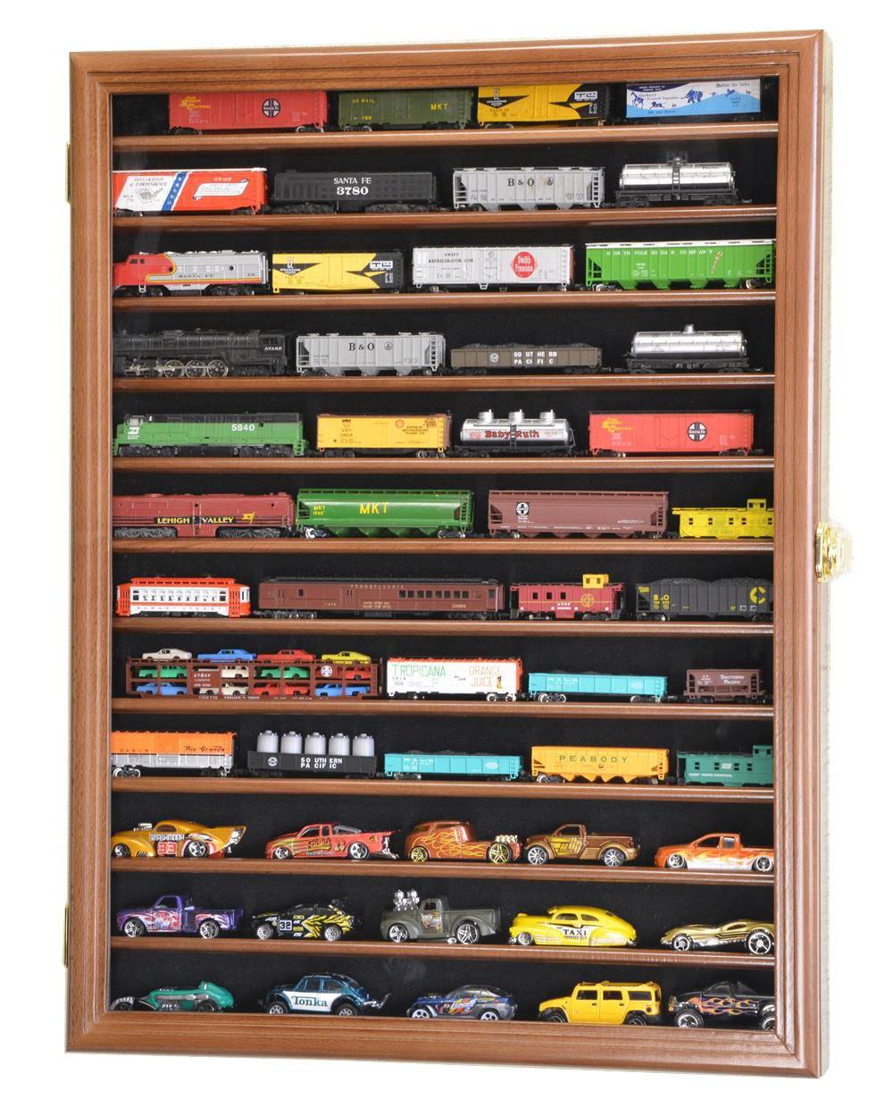 This train display case features 12 rows to fit most N or Z scale train models. The shelves have a slight lip to keep your items from falling. Protected by our ultra-clear specially coated plexiglass. Case comes fully assembled. Heavy duty wall mounting kit included. Mounting hardware shipped in the same package.