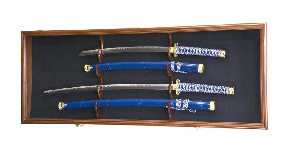 This large set of moveable matching sword stand racks displays US Army Officer Saber, US Army NCO Saber, Japanese Samurai Swords, Civil War Swords, etc. Protected by our ultra-clear, specially-coated, UV-protection acrylic. Front opening door. Case comes fully assembled. Mounting hardware is shipped in the same package.