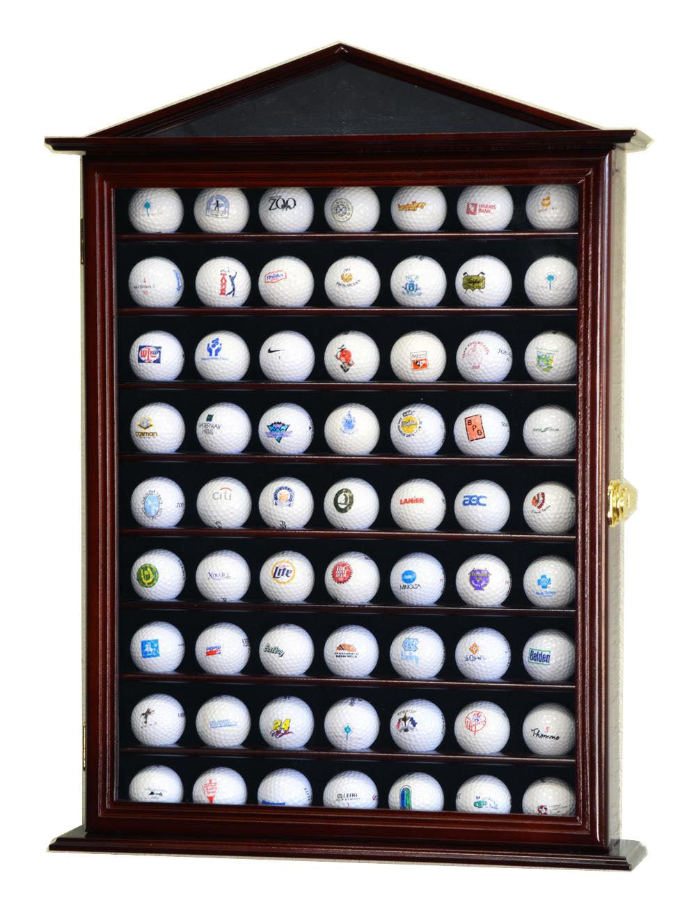 Display it in this beautiful 63 Golf Ball Display Case Cabinet, designed in a designer style with a crown trim, plexiglass door, and 9 grooved wooden shelves to hold up to 63 golf balls.