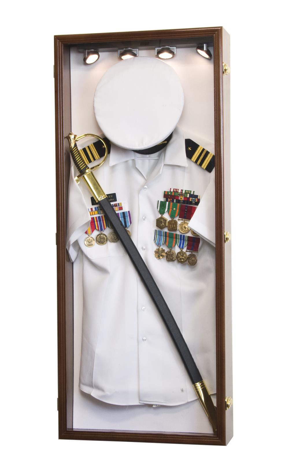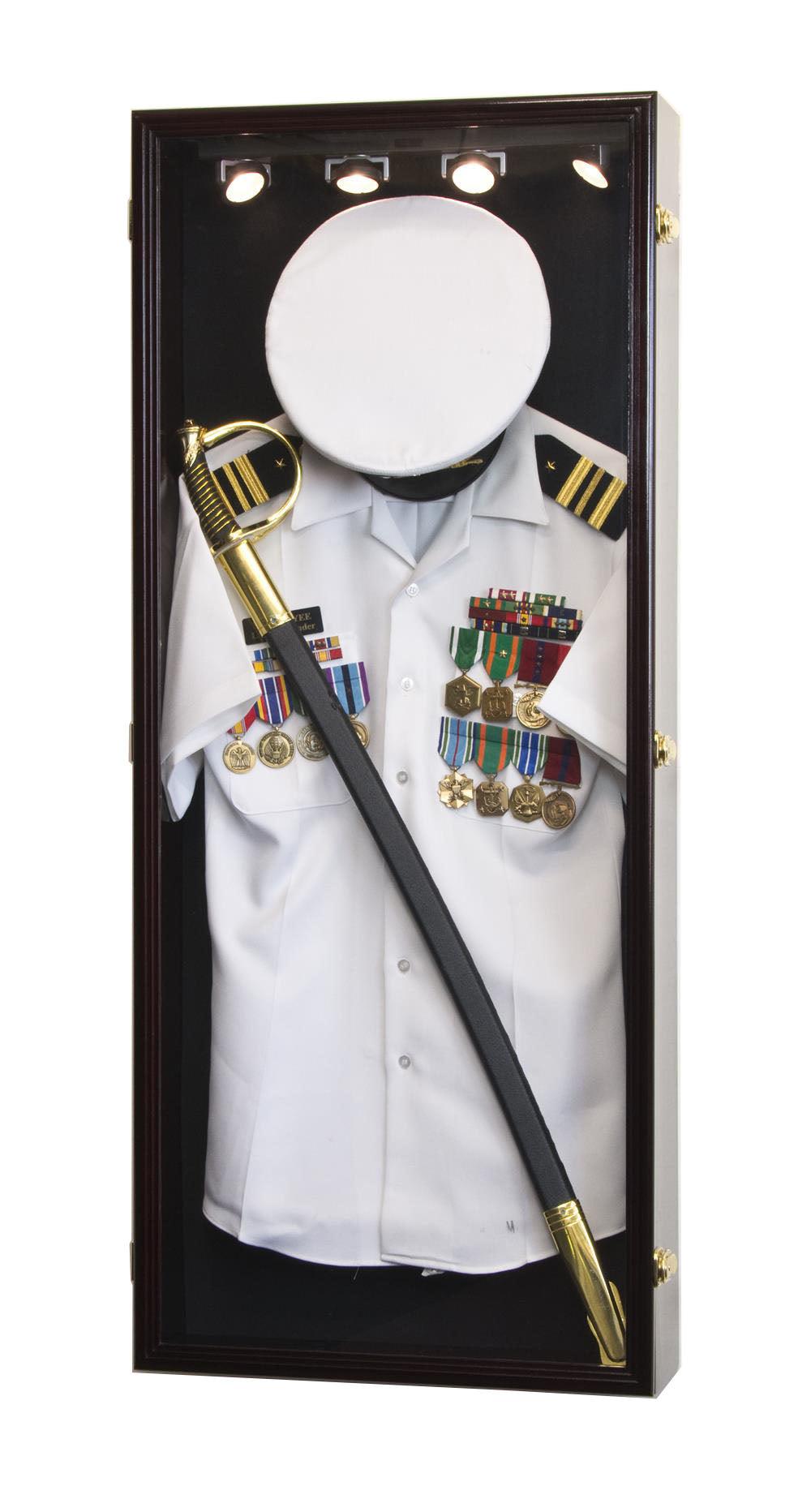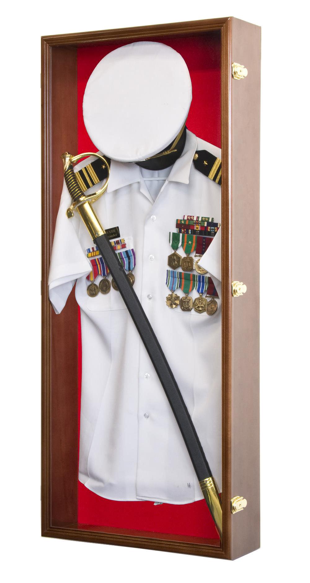 This military shadowbox display case can accommodate 1 large uniform, hat, and even a ceremonial sword. Pinnable felt background and an included matching hardwood hanger keep your uniform secured. Protected by our ultra-clear, specially-coated, UV-protection acrylic. Case comes fully assembled.